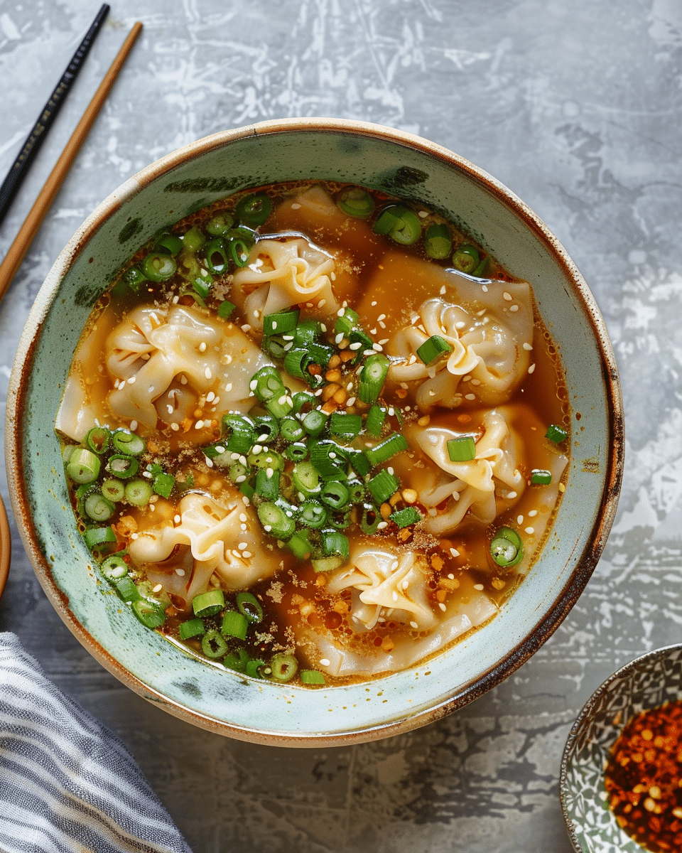A fast and delicious wonton soup recipe with savory broth, tender wontons, and homemade chili oil for extra flavor.