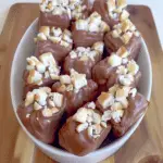 Once frozen, I dip or coat them in melted dark chocolate and let them set for a few minutes before eating.