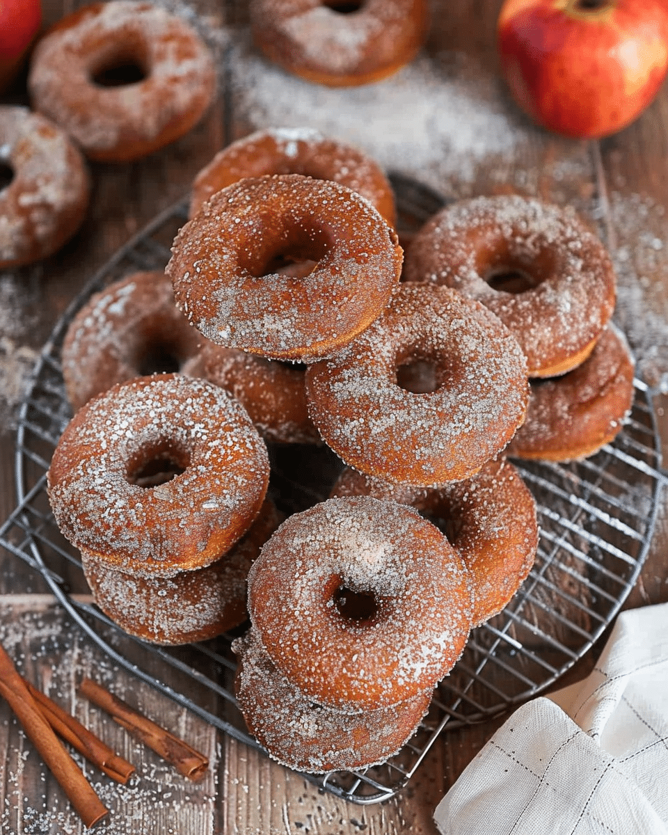 Glazed version: I sometimes drizzle the donuts with an apple cider glaze made from powdered sugar and a splash of cider instead of using cinnamon sugar.