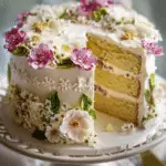 Soft vanilla layers, creamy buttercream frosting, and delicate edible flowers make this Baby in Bloom Cake a dreamy baby shower cake centerpiece. Perfect for spring celebrations, gender reveal parties, and elegant floral themed gatherings.