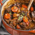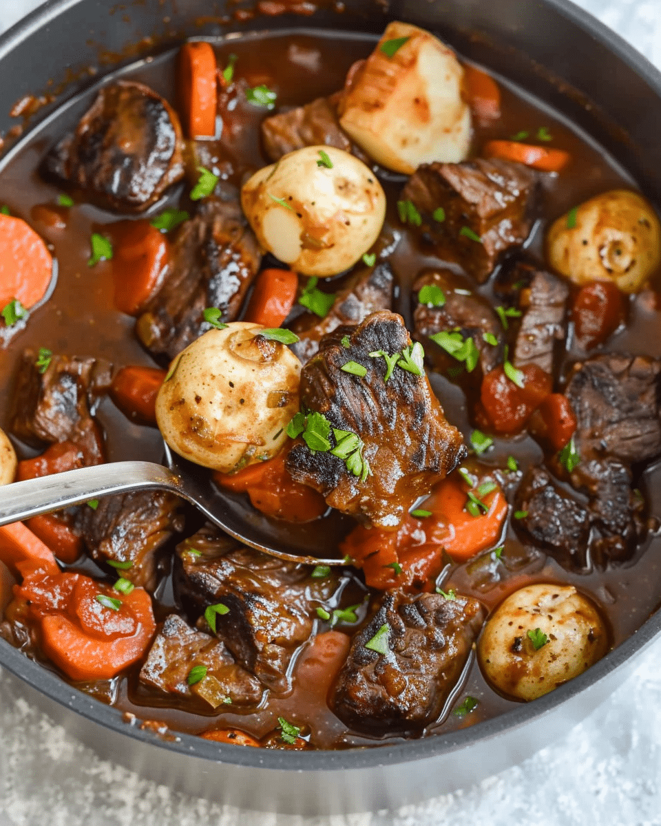 This rich and hearty beef stew is packed with tender beef, bacon, potatoes, carrots, and mushrooms slow-cooked in red wine and broth—comfort food at its finest.