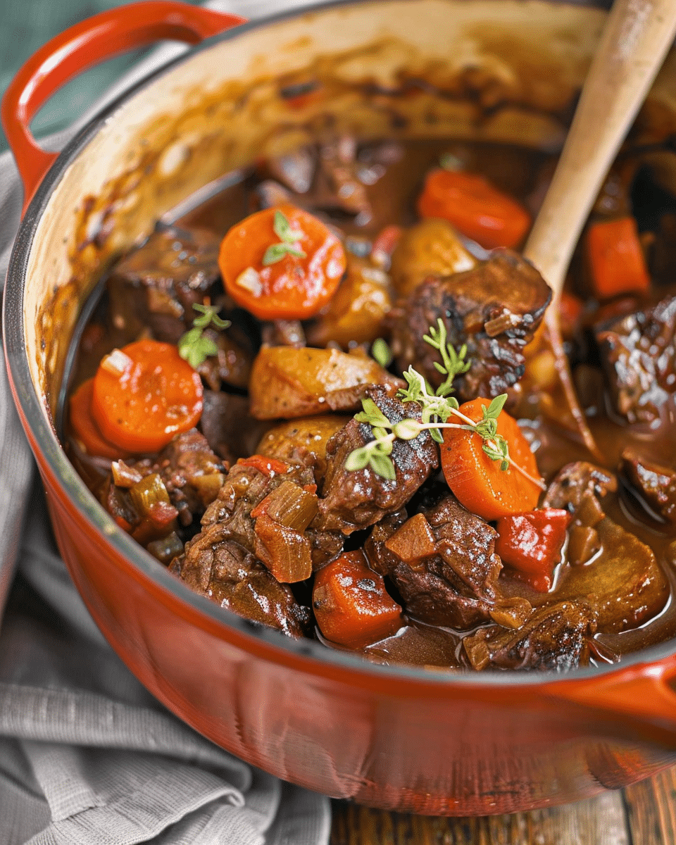 Sometimes I swap the beef with lamb for a richer flavor, or toss in parsnips or turnips alongside the potatoes. If I don’t have red wine, I substitute with more broth and a splash of balsamic vinegar for depth. For a more rustic finish, I occasionally stir in green peas at the end or garnish with chopped parsley.