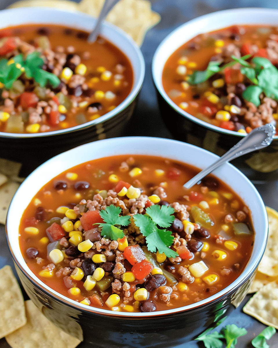This hearty taco soup is loaded with ground beef, beans, corn, tomatoes, and bold Tex-Mex flavor. It’s a one-pot comfort meal that’s easy, customizable, and ready in just 40 minutes.
