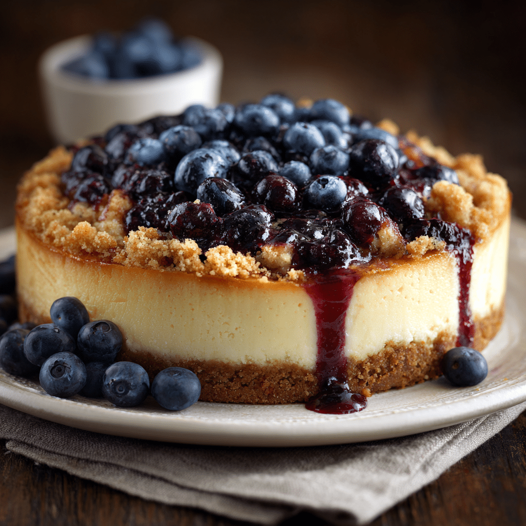 The Best Blueberry Crumble Cheesecake features a smooth cheesecake filling, juicy blueberries, and a golden crumble topping for a decadent and impressive dessert.
