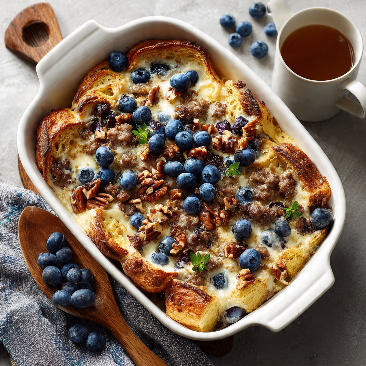 This sweet and savory breakfast bake layers fluffy pancakes, juicy blueberries, and crumbled sausage into a cozy casserole perfect for brunch or meal prep.
