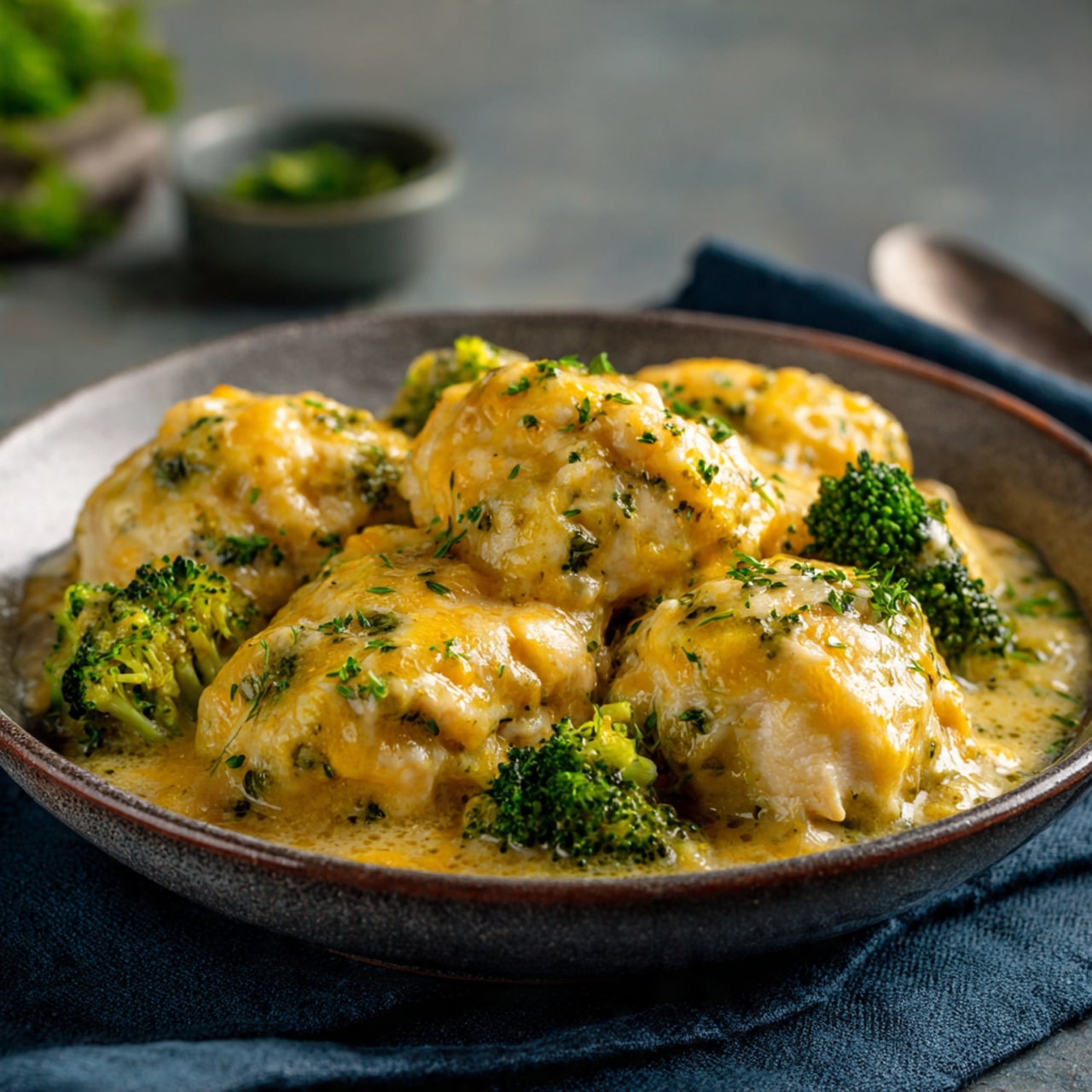 A cozy one-pot meal with tender chicken, cheesy broccoli, and fluffy dumplings simmered in a creamy, savory broth—perfect for weeknights or chilly days.