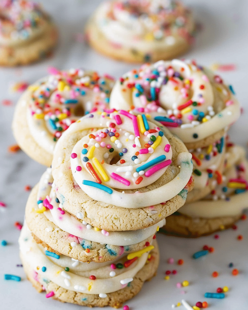 I love these cookies because they’re like cake and cookies all rolled into one. The dough has that nostalgic cake batter flavor, and the cream cheese frosting is creamy and dreamy with a hint of birthday cake essence. They’re colorful, crowd-pleasing, and just plain fun to make and eat. Whether I’m making them for a party or a simple weekend treat, they always bring smiles.