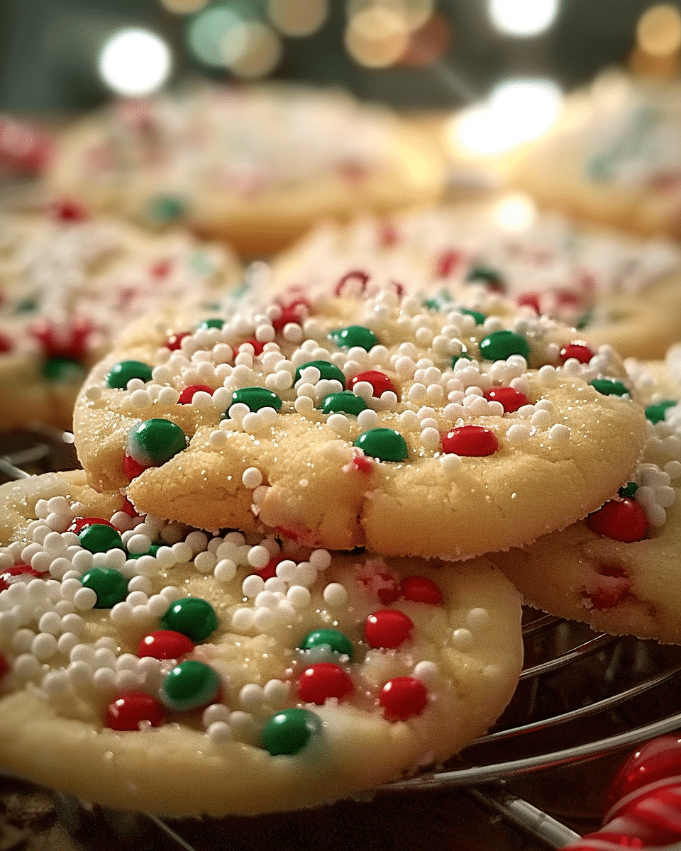 I gently flatten each dough ball with my fingers and sprinkle extra festive sprinkles on top for that holiday sparkle.