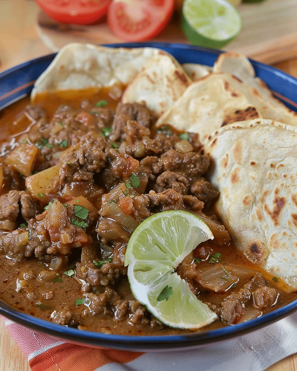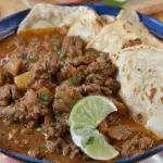 Hearty carne guisada with ground beef and potatoes simmered in a rich tomato chile gravy. Served with warm flour tortillas, this comforting Mexican-style stew is perfect for family meals.