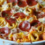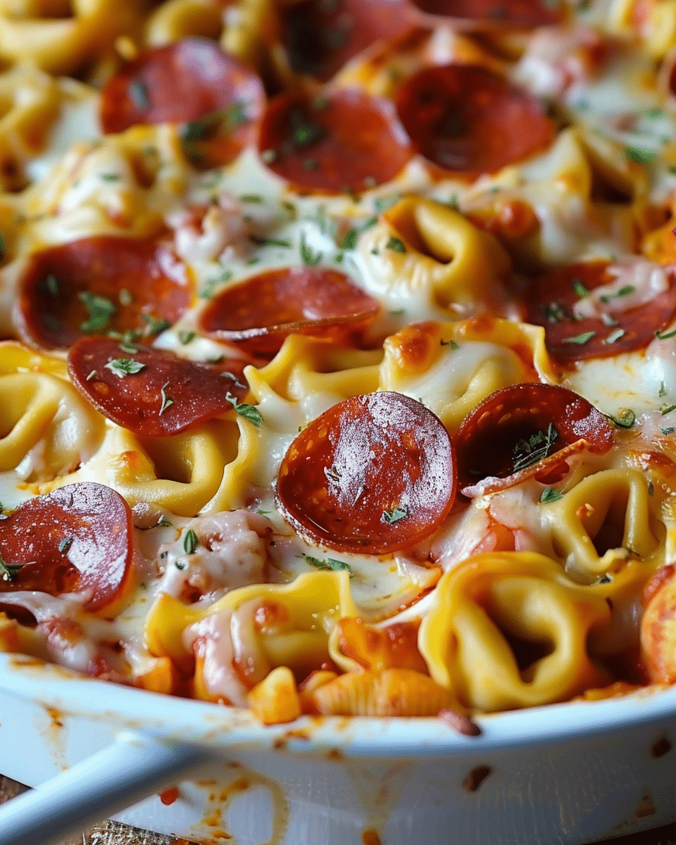 This cheese tortellini pepperoni pizza casserole recipe is the ultimate comfort food—loaded with melty cheese, pizza sauce, and tender pasta baked to bubbly perfection.