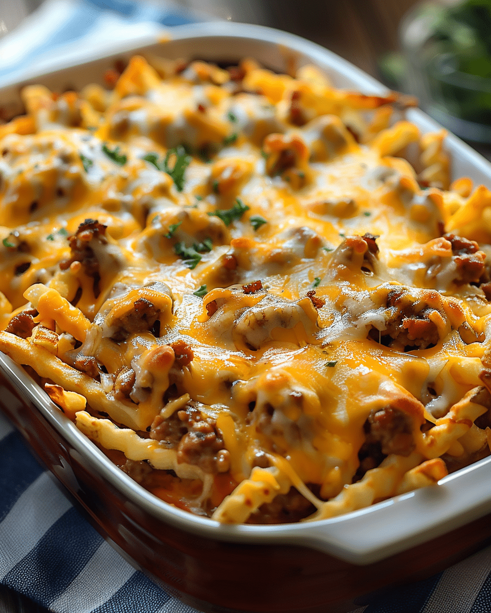 This hearty casserole layers seasoned ground beef, crispy fries, melty cheese, and tangy burger sauce for the ultimate family-friendly comfort meal.