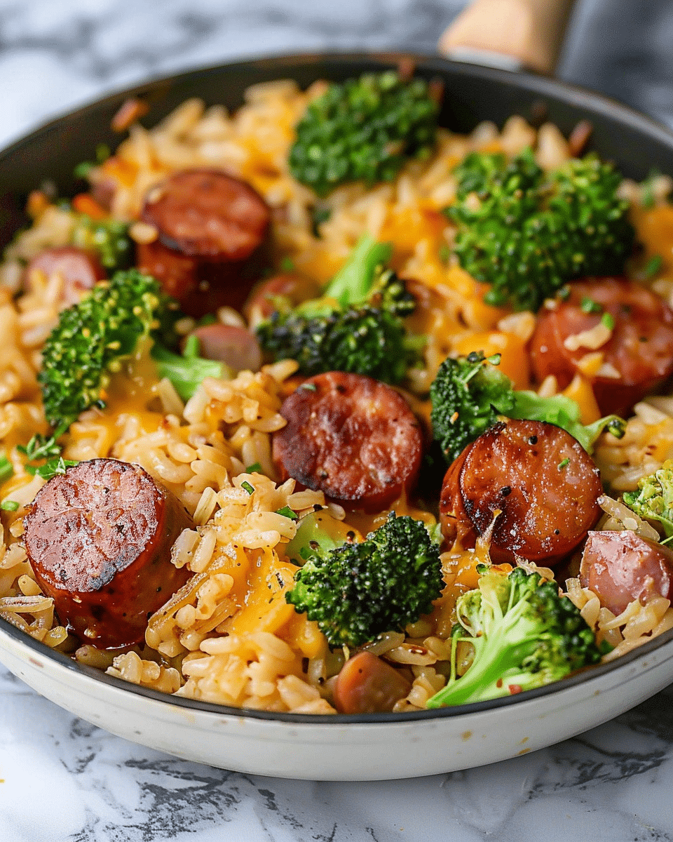 I love how comforting and filling this skillet meal is. The kielbasa gives it a rich, smoky flavor, while the rice and broccoli soak up all the goodness from the broth and cheese. It comes together quickly, and since everything cooks in one pan, it saves me so much time in the kitchen. It’s also super customizable depending on what I have on hand, and it reheats like a dream.