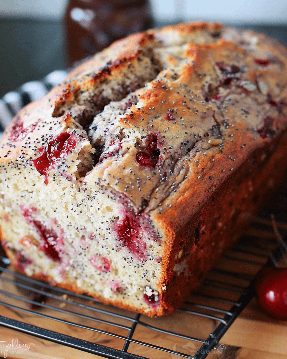 I like how the cherry pie filling creates beautiful swirls and adds bursts of fruity sweetness in every slice. The almond and poppyseed combination gives the bread a delicate texture and rich flavor that feels comforting and nostalgic.
