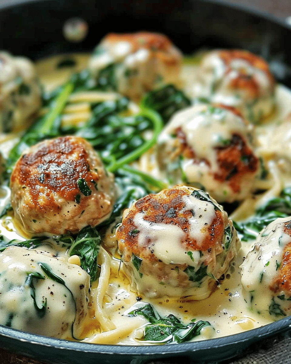 I love this recipe because it combines the best of two comfort food favorites — meatballs and creamy Alfredo sauce. The chicken meatballs are soft and flavorful thanks to the ricotta, and the spinach Alfredo is rich without being heavy. It’s an easy dish that feels special, whether I’m serving it over pasta, rice, or just as it is with a crusty piece of bread.