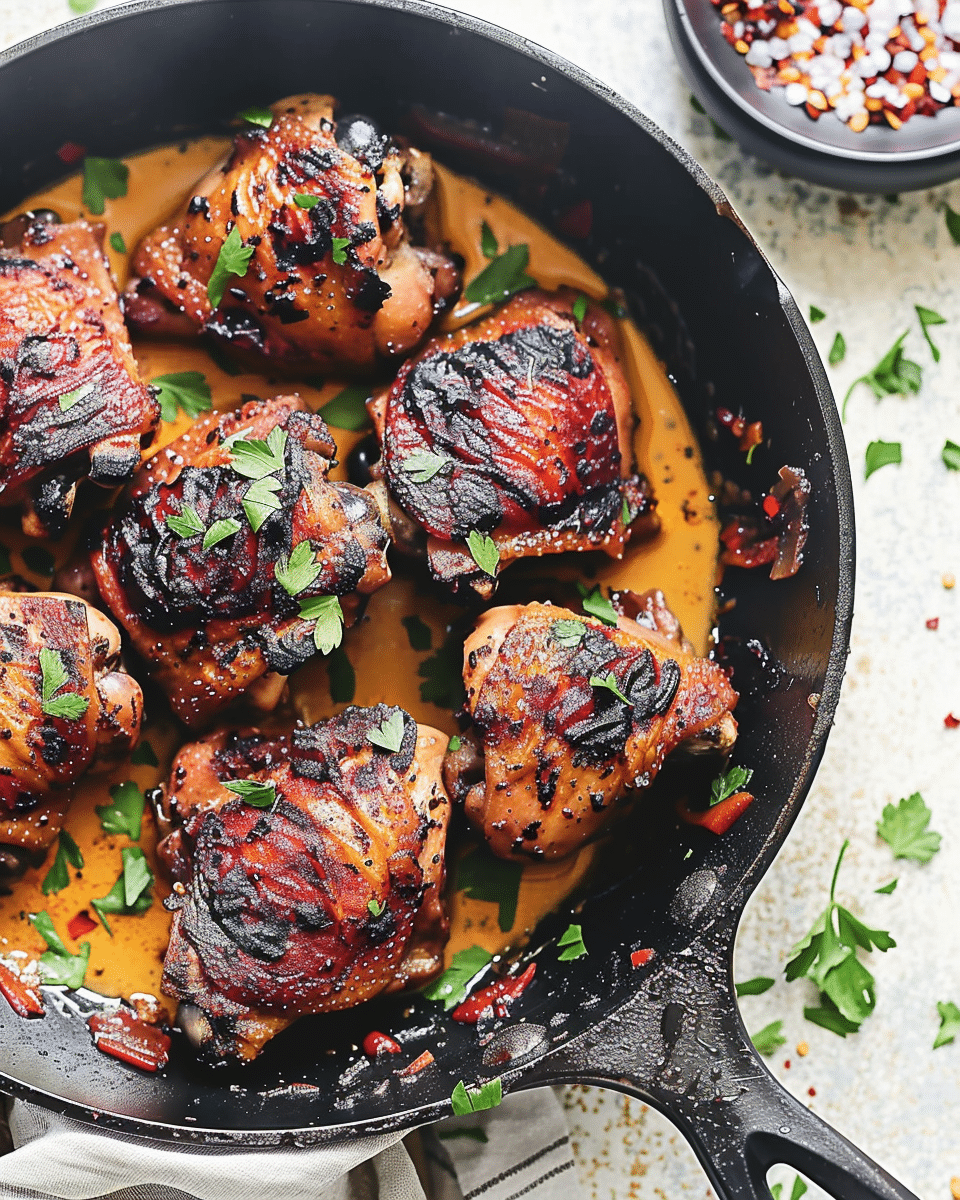 Place chicken thighs skin-side down and sear until crispy, about 7–8 minutes. Flip and cook an additional 15–25 minutes, until internal temperature reaches 165°F. Transfer chicken to a plate.