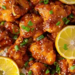 Finally, I toss the fried chicken in the warm lemon sauce until it’s evenly coated. I like to garnish it with lemon slices, green onions, and sesame seeds before serving.