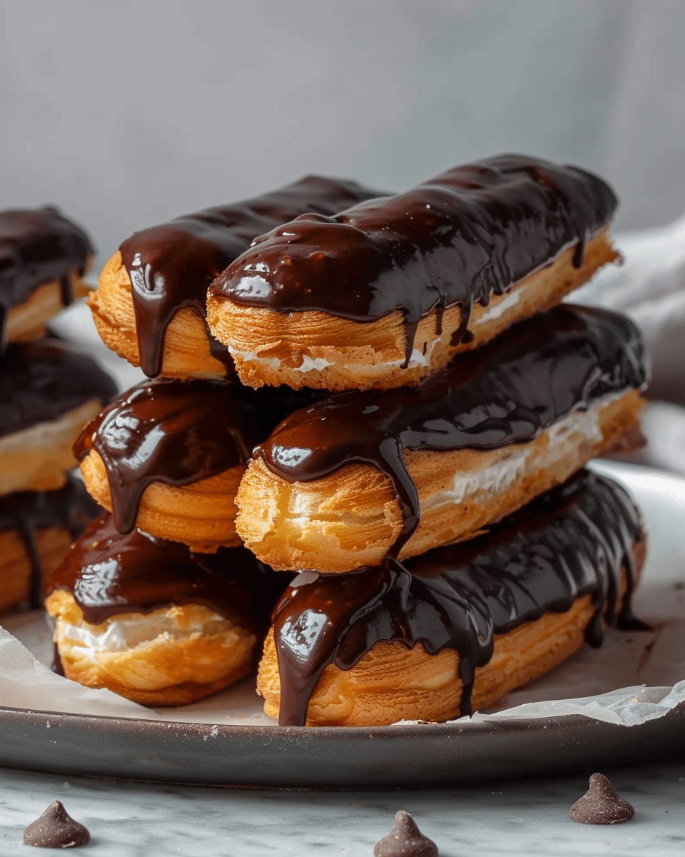 Classic chocolate eclairs made with light choux pastry, filled with creamy pastry cream, and topped with rich chocolate glaze for an irresistible dessert.