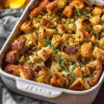 I love how this stuffing hits all the right notes—savory, herby, tender in the center with those irresistible crispy edges. It’s made from simple ingredients but tastes like something special thanks to layers of flavor from caramelized onions, garlic, and fresh herbs like sage and rosemary. I also like that it’s flexible—I can use vegetable broth for a vegetarian version or add sausage or mushrooms to turn it into a heartier dish. It’s easy to make ahead, bake, and reheat, which makes my holiday cooking so much easier.