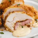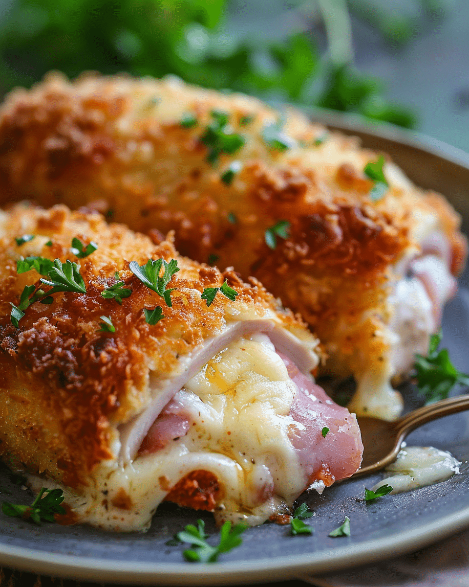 Crispy baked chicken stuffed with ham and Swiss cheese, topped with a creamy Dijon parmesan sauce for a classic comfort meal.