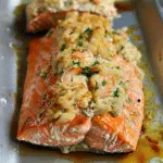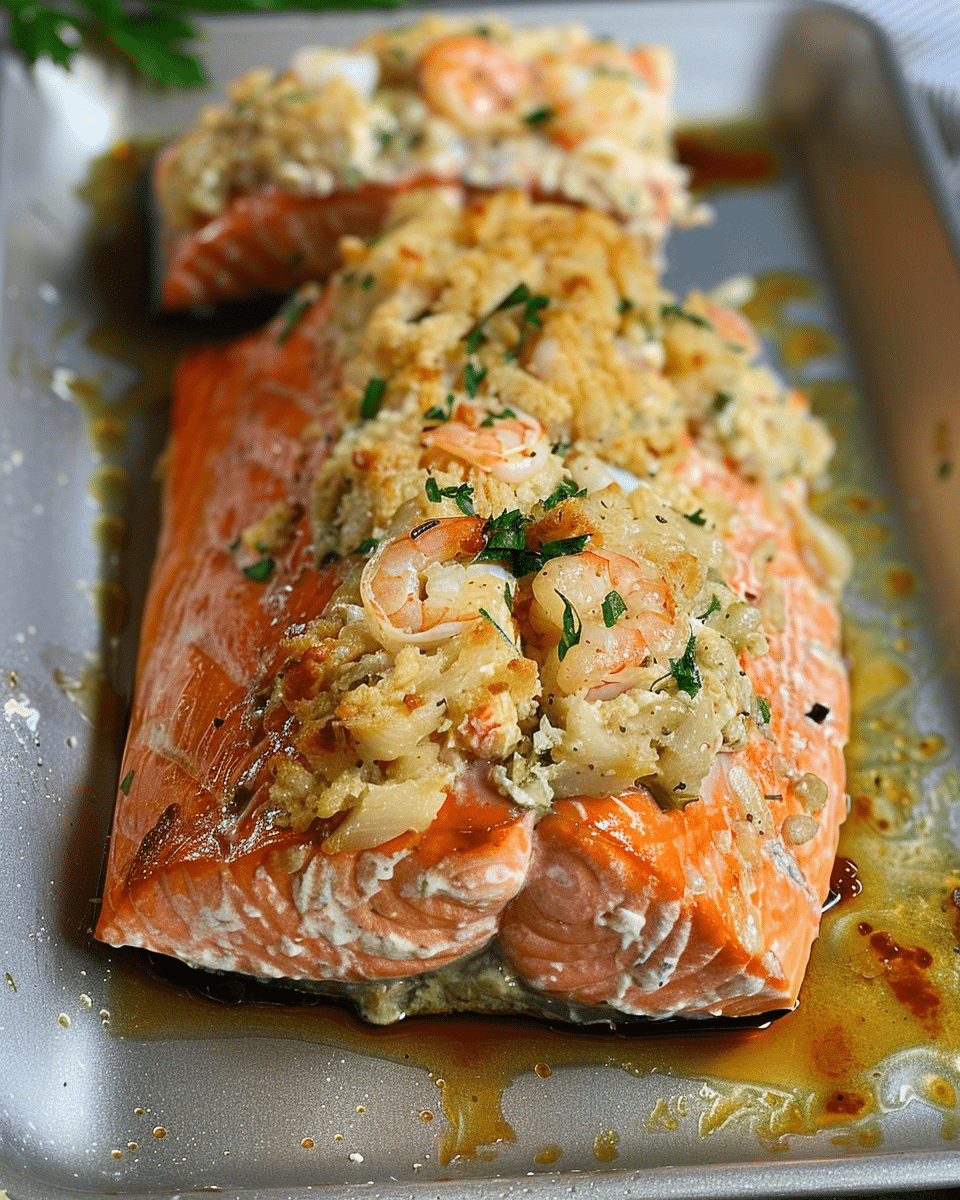 This elegant stuffed salmon is filled with creamy crab and herbs, topped with tender shrimp and lemon butter. A rich, low-carb seafood dinner perfect for special occasions.