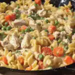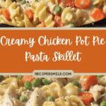 This creamy chicken pot pie pasta skillet is a cozy one-pan dinner loaded with tender chicken, veggies, and rich sauce.