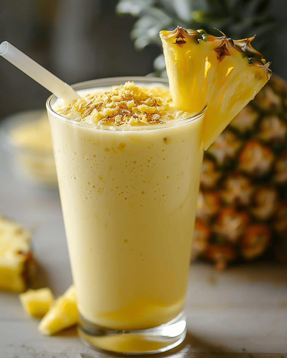 Garnish with a pineapple wedge, banana slice, or shredded coconut for a tropical touch.