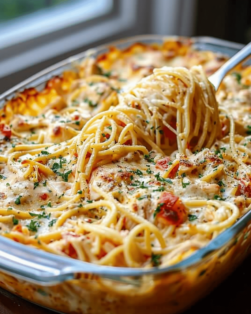 PrintCreamy Rotel Chicken Spaghetti Casserole