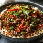 I love how this dish balances heat, sweetness, and umami in one pan. It comes together in just 15 minutes, making it ideal for busy weeknights. The texture of the crispy beef and the soft rice is seriously satisfying, and the customizable toppings like spring onions or sesame seeds add freshness and crunch. Plus, everything cooks in a single pan—less mess, more flavor.