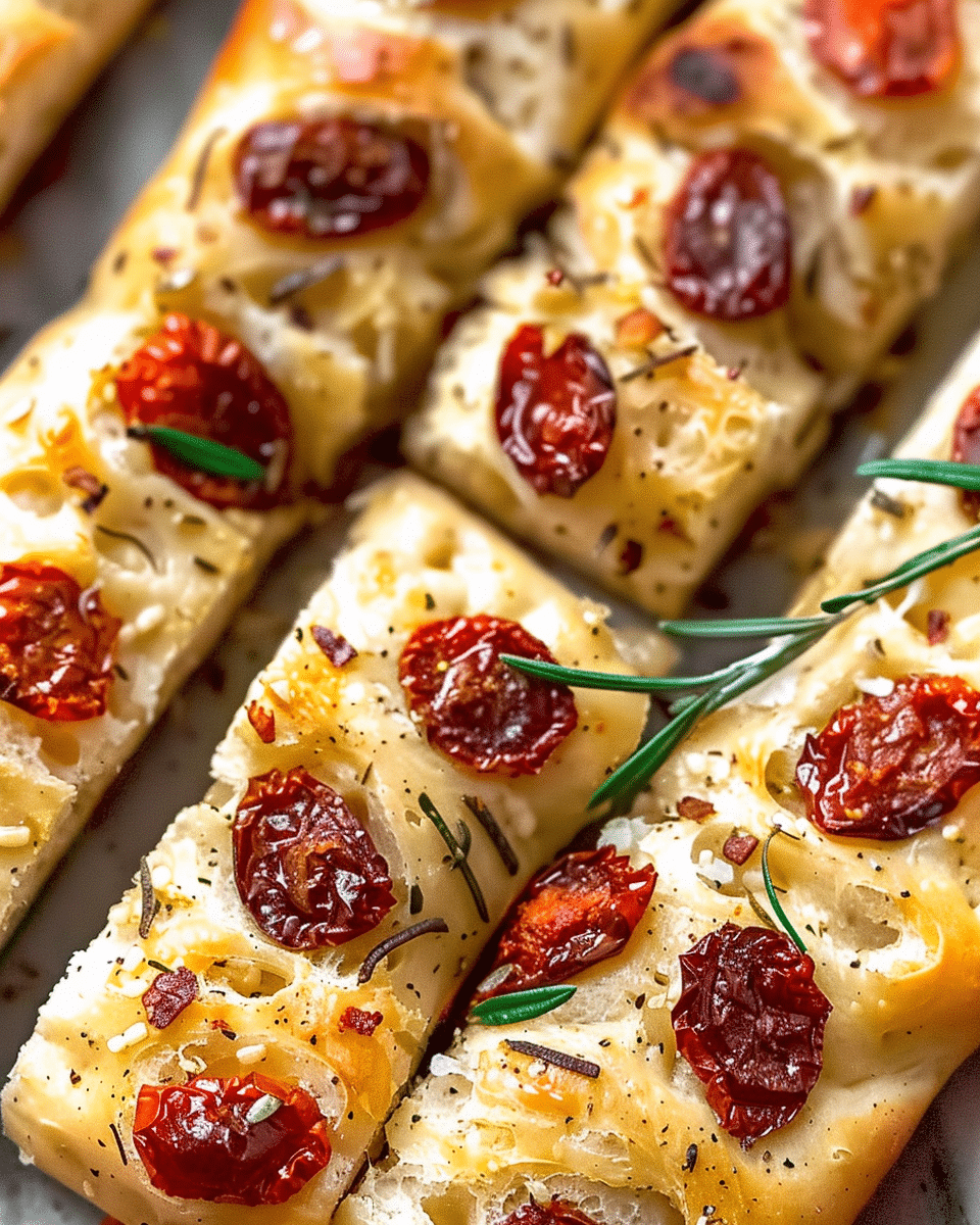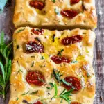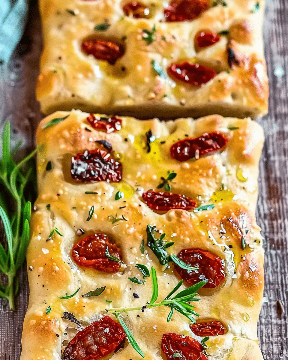Golden, airy, and loaded with garlic, rosemary, and sun-dried tomatoes—this crispy focaccia is the perfect homemade bread for any occasion.