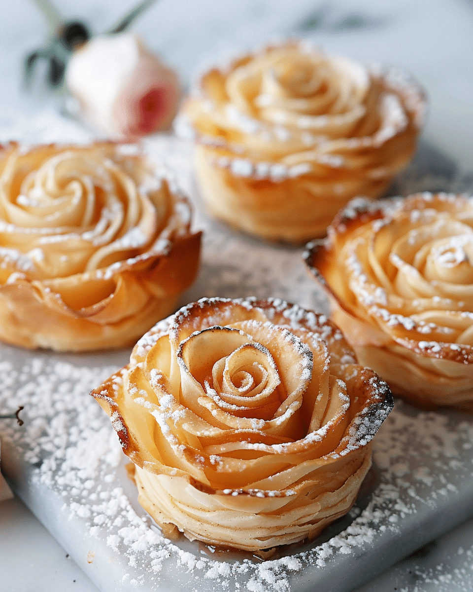 Delicate apple rose pastry blooms are a beautifully sweet treat made with flaky puff pastry, tender apple slices, jam, and cinnamon. This elegant dessert is perfect for holidays, tea parties, and special occasions.