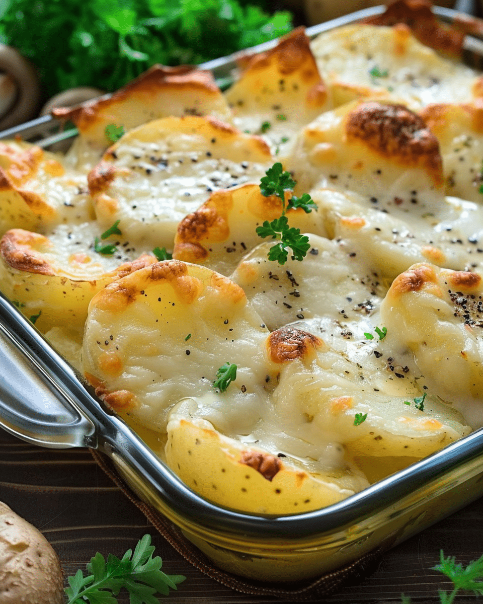 I sometimes add shredded cheese between the layers (gruyère, cheddar, or Parmesan work great) to turn it into more of a gratin. When I want to make it vegetarian, I use vegetable broth instead of chicken. For extra flavor, I’ve also added sautéed leeks or a pinch of fresh thyme. And when I want a crispier top, I broil it for the last 2–3 minutes.