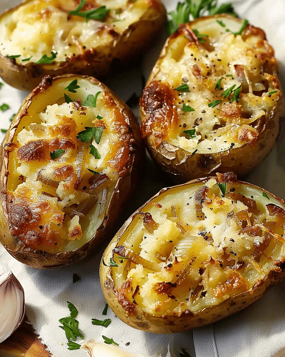 Crispy-skinned baked potatoes filled with melty Gruyère, buttery sour cream, and crispy Frenched onions—this comforting side dish is a flavorful twist on a classic favorite.