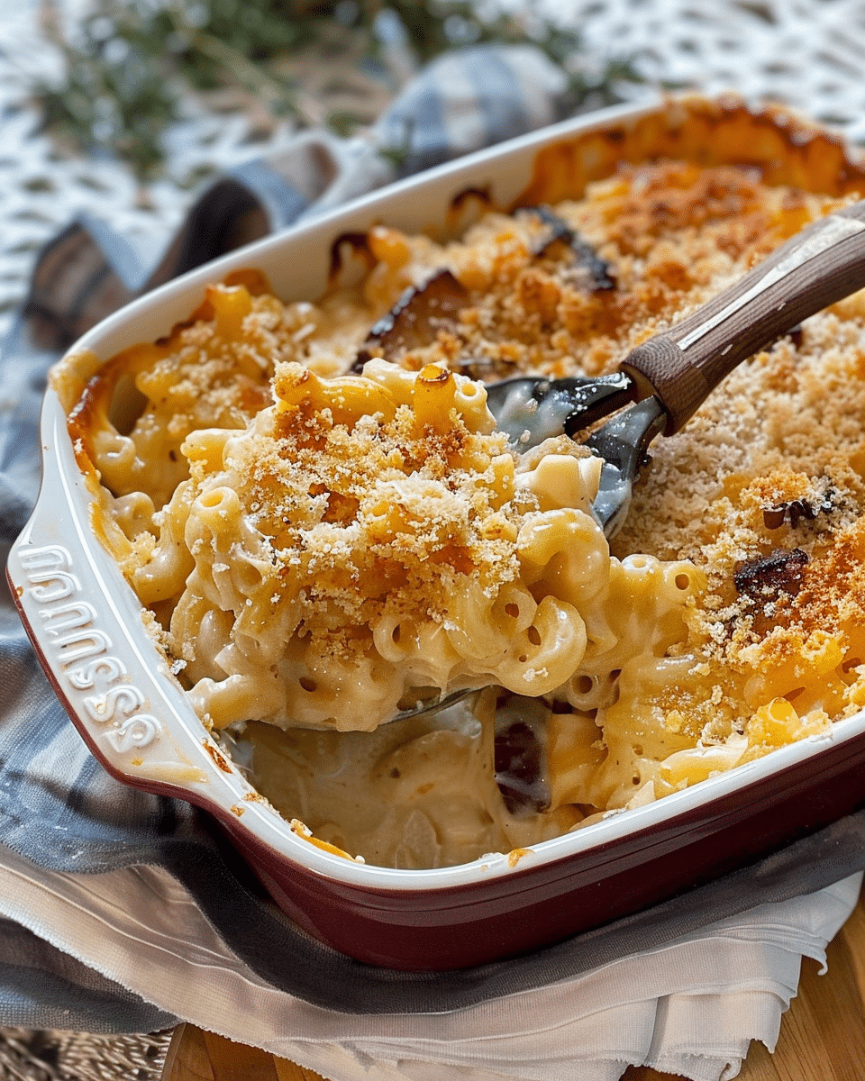 A decadent twist on mac and cheese! Creamy pasta loaded with caramelized onions, Gruyère, cheddar, and a golden breadcrumb topping.
