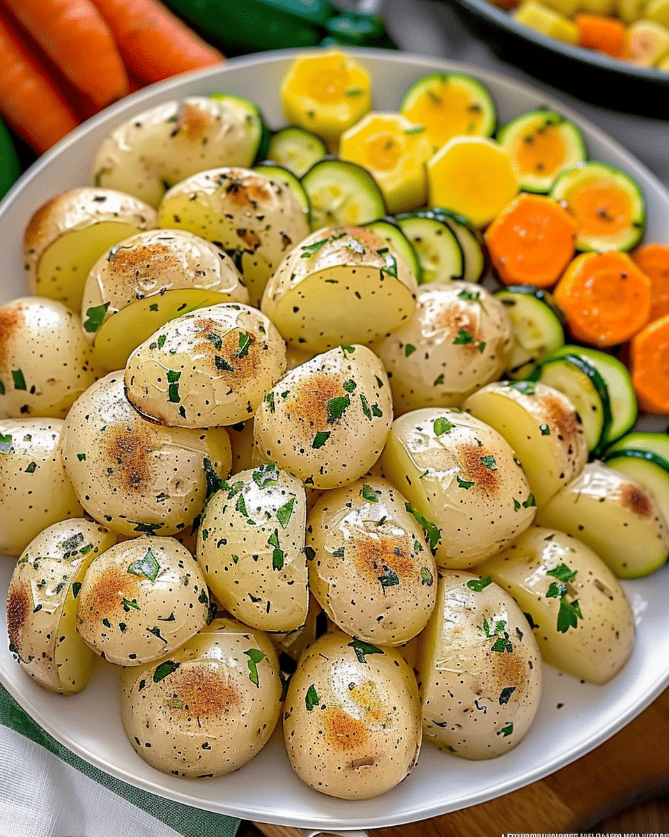 A colorful medley of roasted potatoes, carrots, and zucchini seasoned with fresh garlic, thyme, and rosemary—an easy and flavorful veggie side for any meal.
