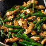 Tender chicken and crisp green beans tossed in a savory stir fry sauce for a quick, flavorful meal.