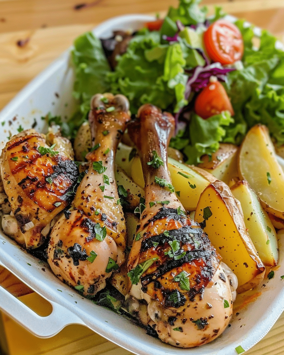 PrintGrilled Chicken Drumsticks with Crispy Potato Wedges and Fresh Salad