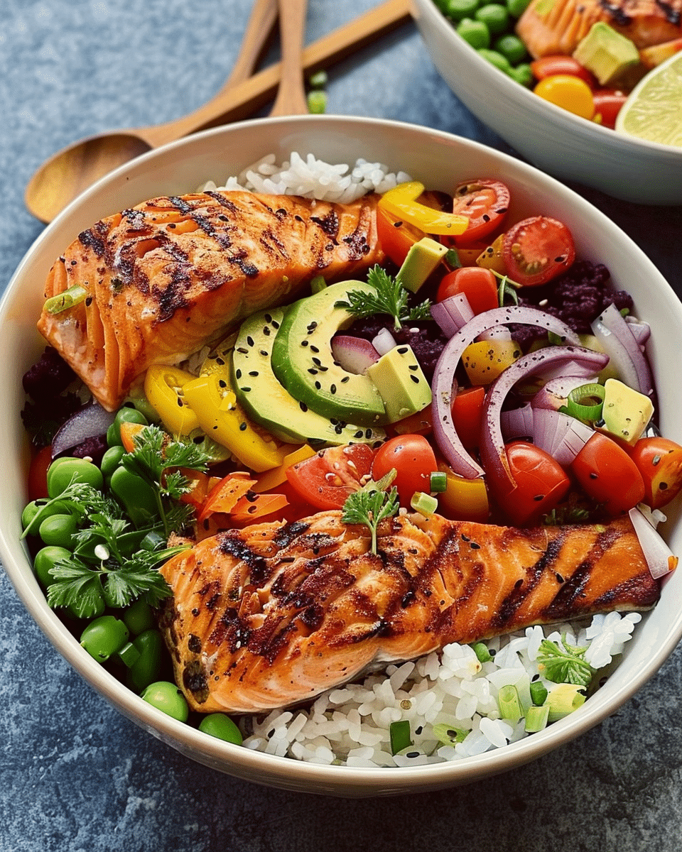 A nourishing bowl filled with grilled salmon, fresh veggies, rice, and a savory sesame dressing—packed with flavor and balanced nutrition.