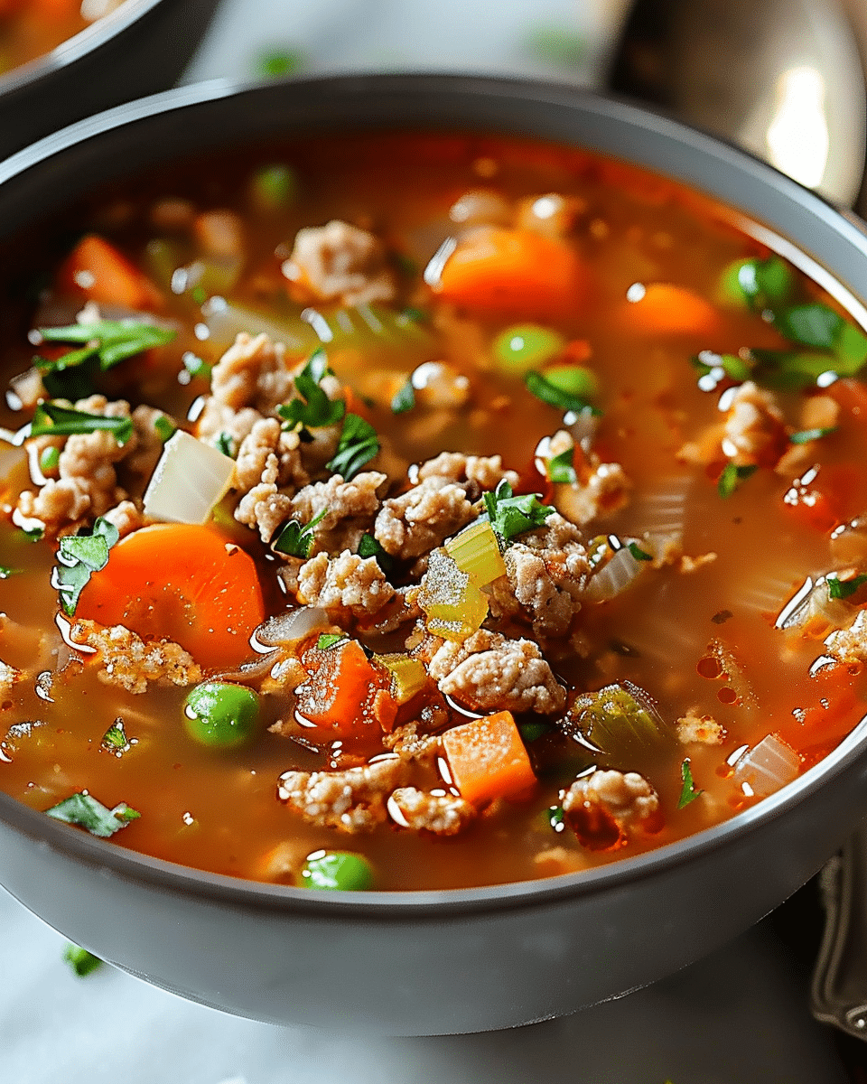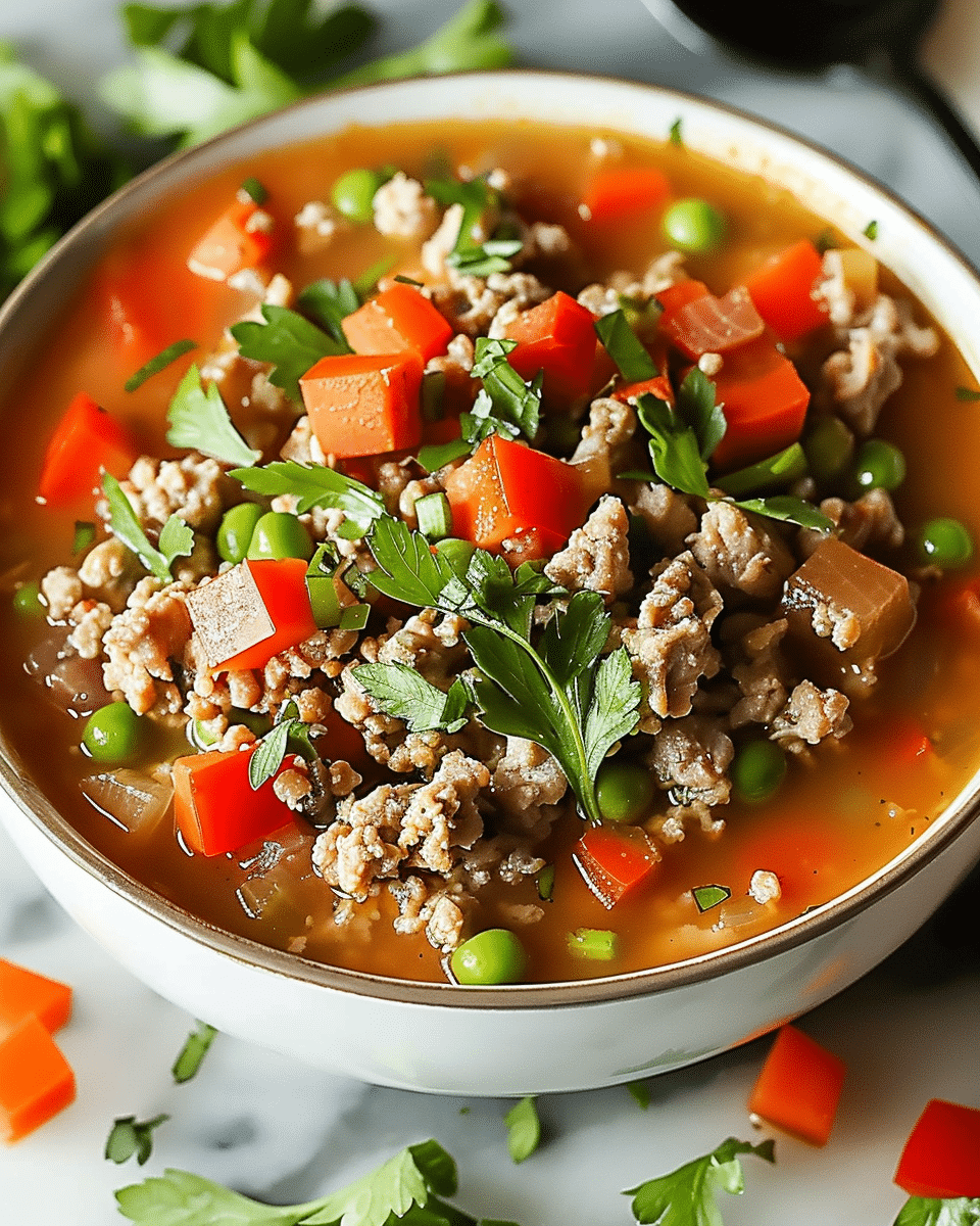 This hearty ground turkey soup is packed with lean protein, fresh vegetables, and savory spices. A cozy, colorful bowl perfect for chilly nights or healthy weeknight dinners.