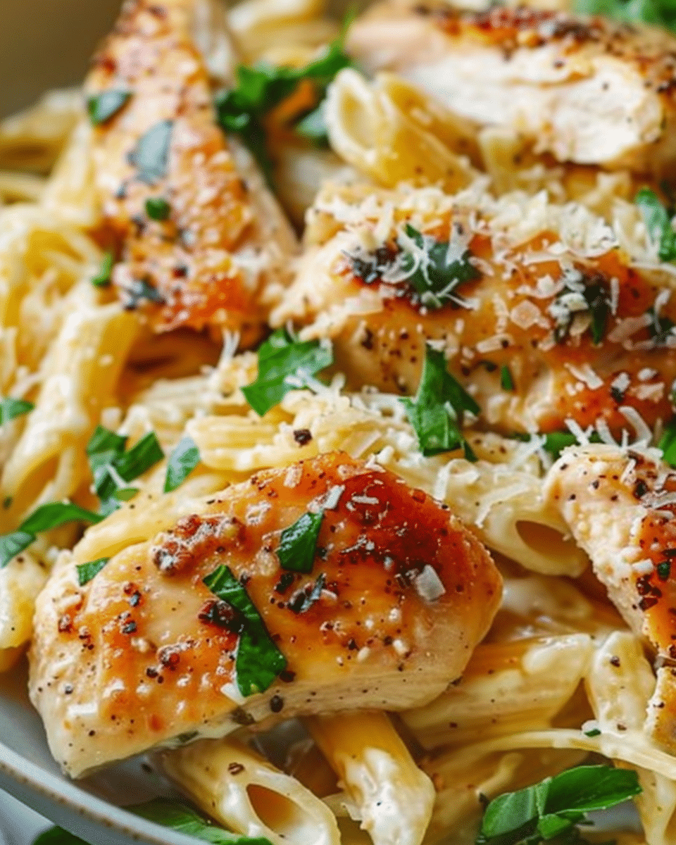 A lighter take on comfort food—this pasta is creamy, garlicky, and loaded with lean chicken and parmesan for a satisfying yet healthy meal.
