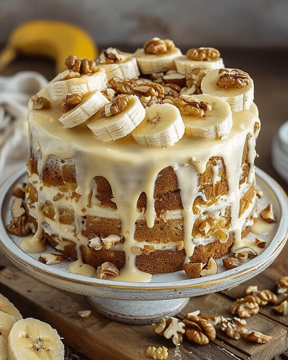 A soft, dreamy banana cake layered with creamy custard, crunchy walnuts, and silky white chocolate for a melt-in-your-mouth dessert that feels truly special.