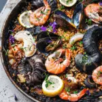 This spooky seafood paella is packed with octopus, shrimp, lobster, and a haunting black hue from cuttlefish ink. A dramatic and delicious Halloween dinner centerpiece!