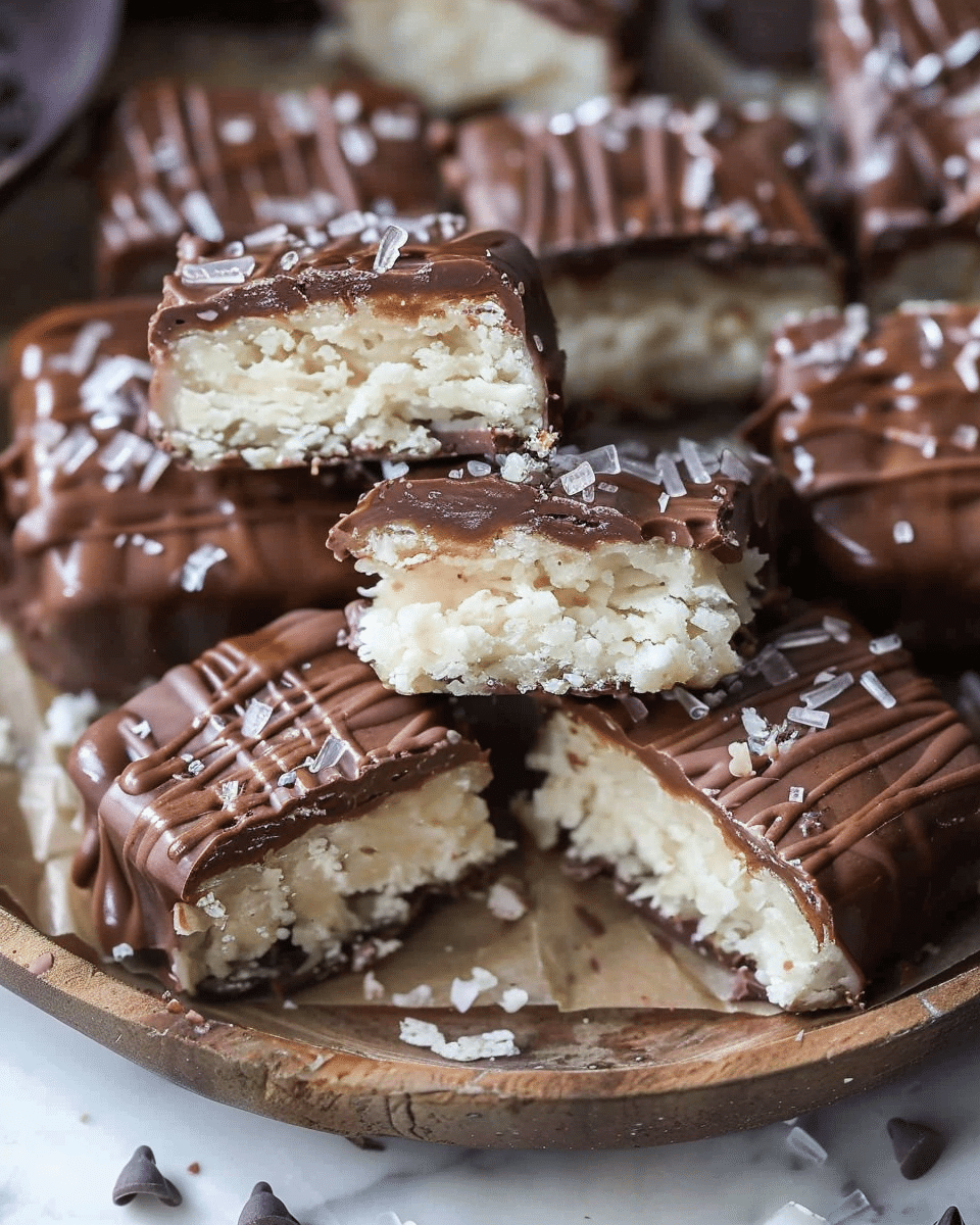 While they chill, I melt the chocolate until smooth. Using two forks, I dip each coconut bar into the melted chocolate, making sure it’s fully coated. I let any excess chocolate drip off before placing them back on the plate.