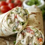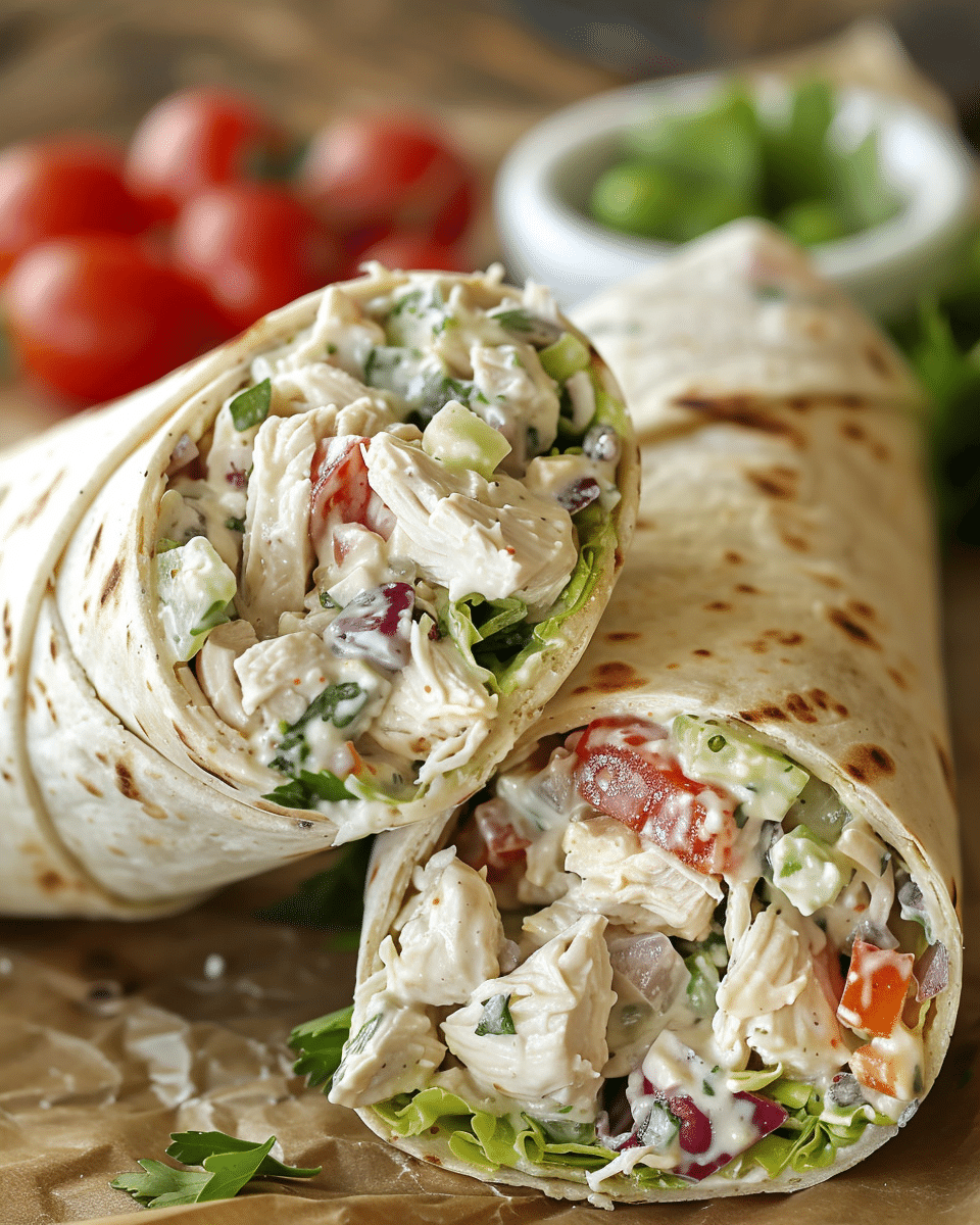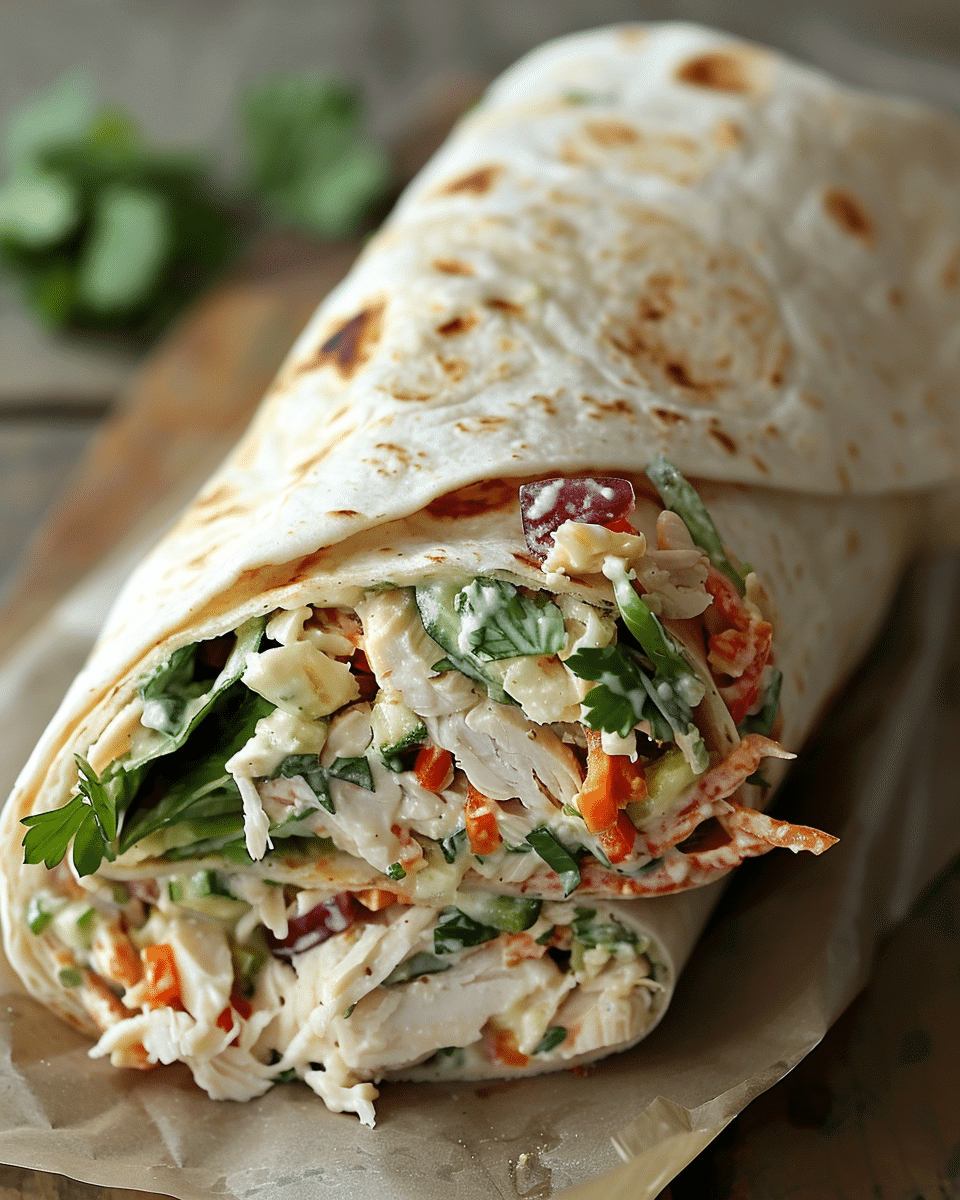 Fresh and creamy homemade chicken salad wrap packed with tender chicken, crunchy veggies, and a tangy dressing, perfect for a quick meal.