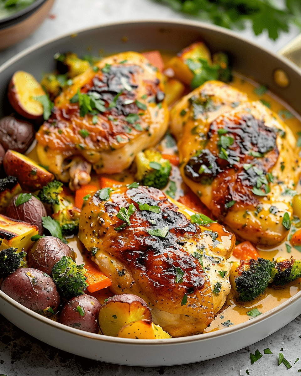 This easy sheet-pan dinner pairs juicy chicken with caramelized potatoes and colorful veggies tossed in a sweet and tangy honey mustard glaze.