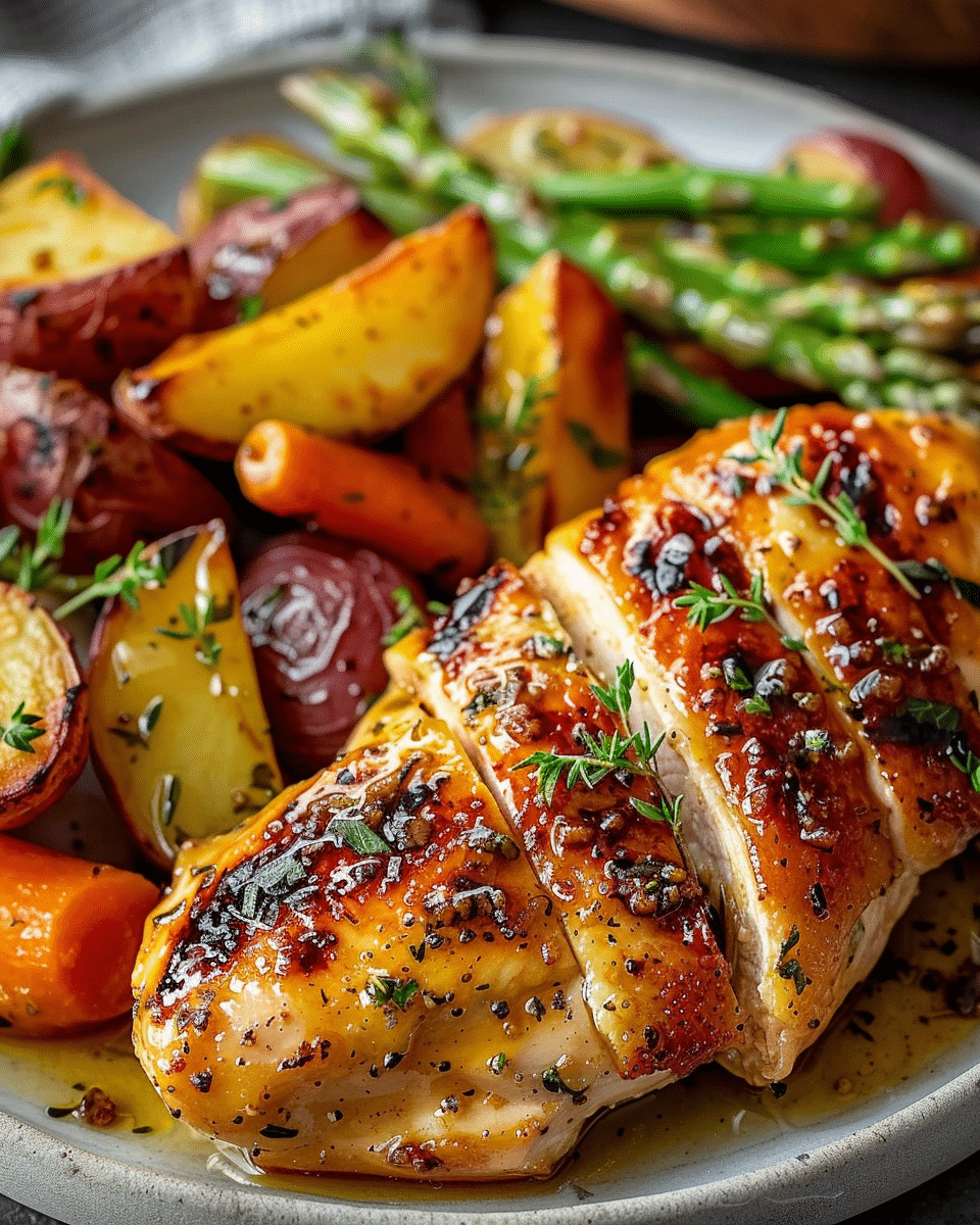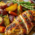 Bake everything for 25–30 minutes, flipping the veggies halfway through for even browning. The chicken is done when it reaches an internal temperature of 165°F (74°C), and the vegetables should be caramelized and fork-tender.