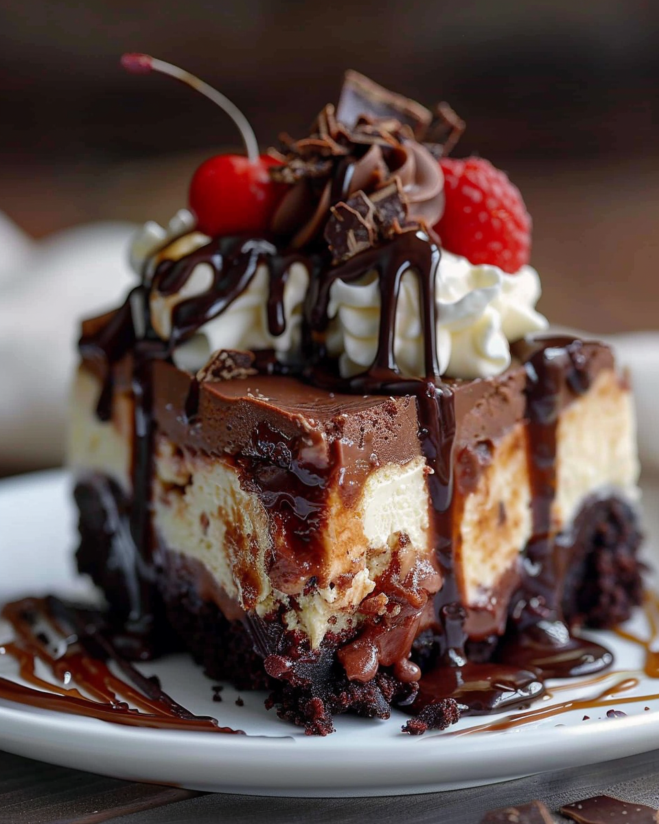 I enjoy this recipe because it looks incredibly impressive while still being manageable when broken into layers. Each component brings something special, from deep chocolate flavor to smooth cheesecake and warm fudge on top. I also like how customizable it is, making it perfect for birthdays, holidays, or anytime I want a show-stopping dessert.