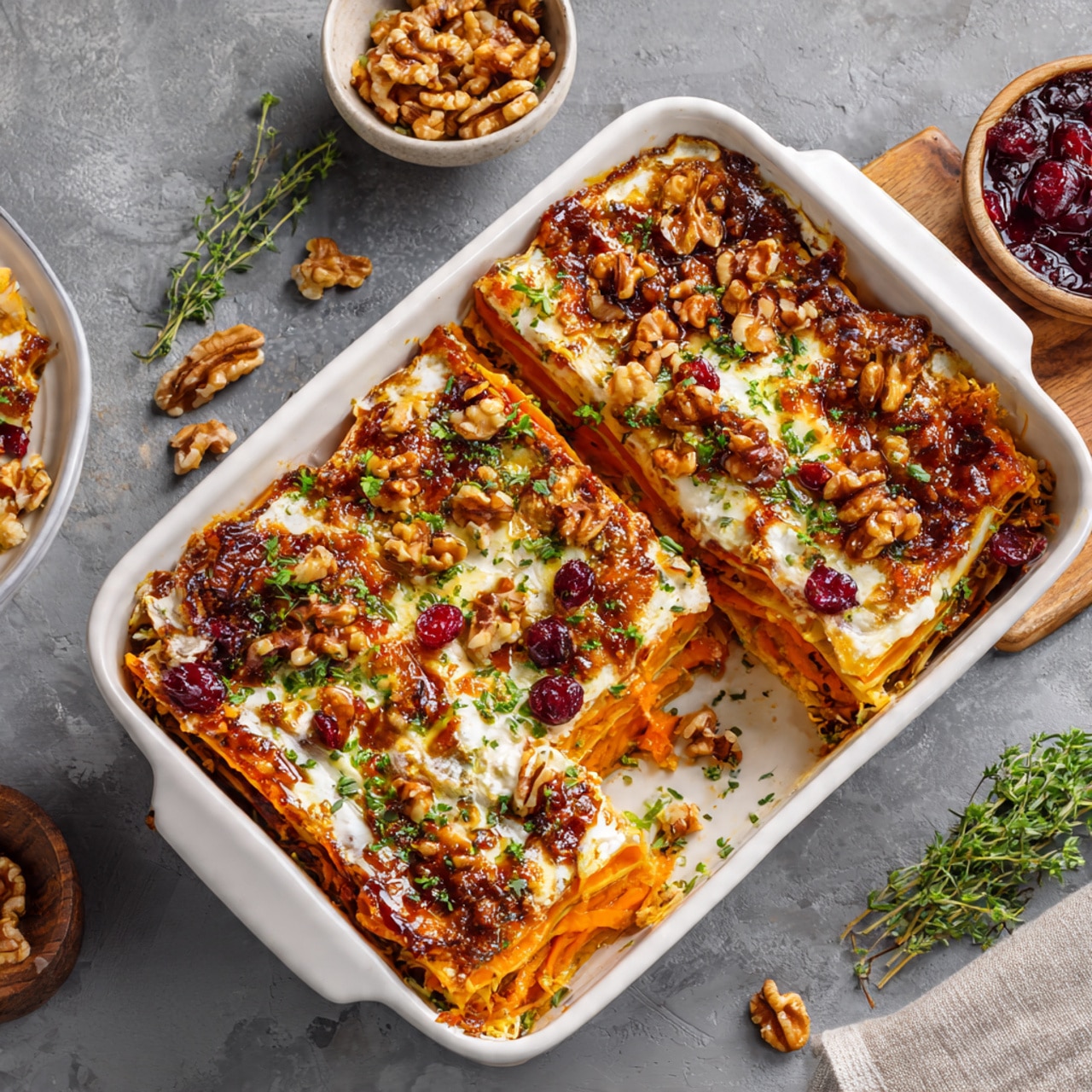 A colorful, veggie-packed lasagna made with roasted sweet potatoes, squash, and carrots, layered with feta, walnuts, and a tangy cranberry glaze.