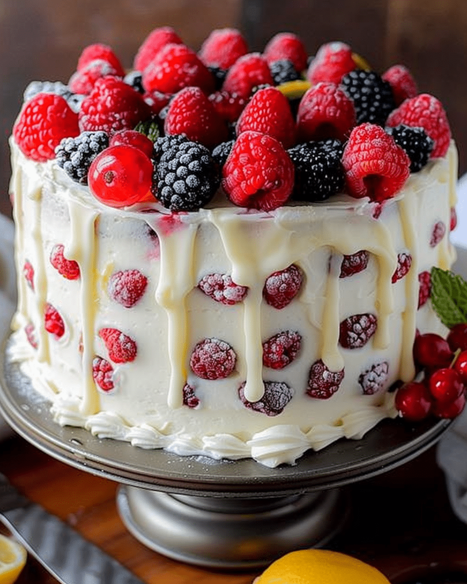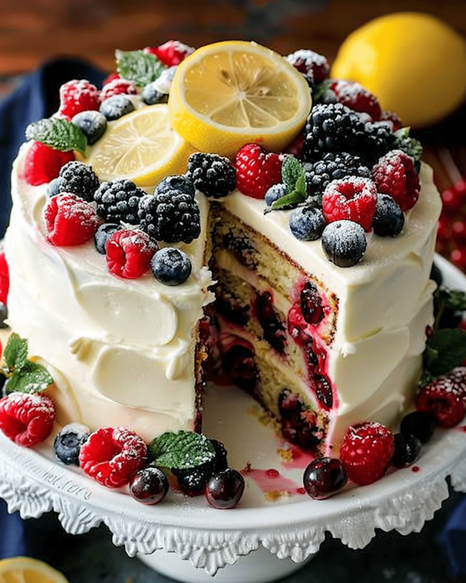 This show-stopping lemon berry cake is bursting with citrus flavor, layered with fresh berries, and topped with a snowy lemon frosting—perfect for your holiday table.