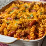 I love this dish because it’s a playful mash-up of two classic favorites: chili cheese dogs and pasta bake. It’s hearty, creamy, and full of nostalgic flavor. I don’t need fancy ingredients or complicated steps—just simple pantry staples and about 30 minutes from prep to plate. It’s a guaranteed hit with both kids and adults, and it’s endlessly customizable based on what I have in the fridge.