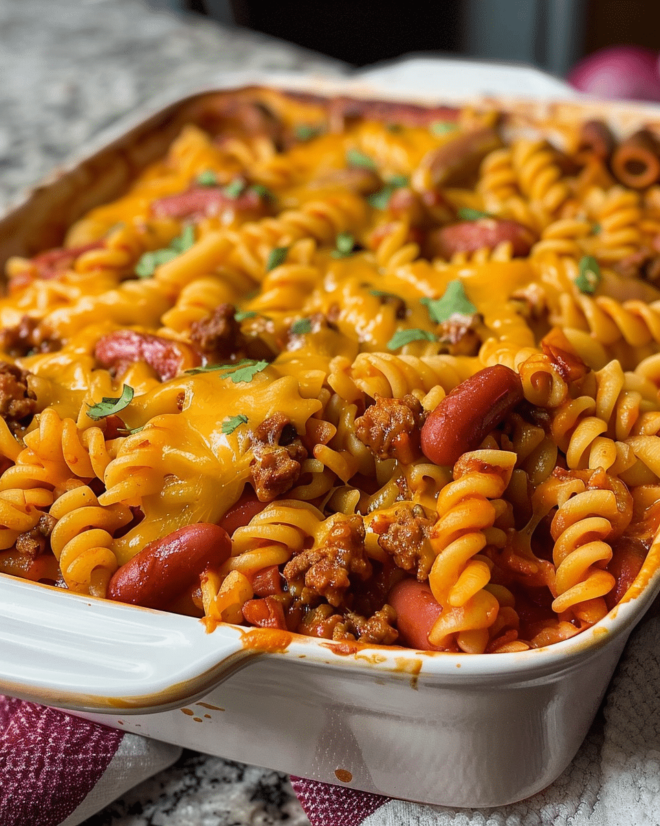 All your favorite chili dog flavors baked into one cheesy, comforting pasta dish! Perfect for busy weeknights, game days, or whenever you crave something hearty and fun.